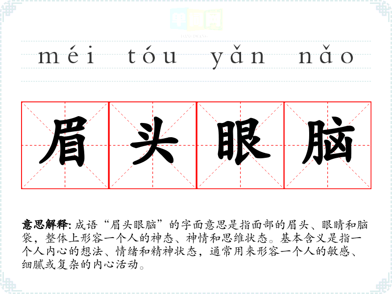 成语“眉头眼脑”的字面意思是指面部的眉头、眼睛和脑袋,整体上形容一个人的神态、神情和思维状态。基本含义是指一个人内心的想法、情绪和精神状态,通常用来形容一个人的敏感、细腻或复杂的内心活动。