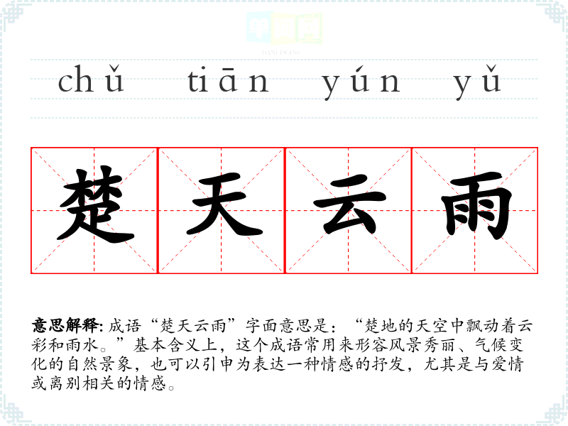 成语“楚天云雨”字面意思是:“楚地的天空中飘动着云彩和雨水。”基本含义上,这个成语常用来形容风景秀丽、气候变化的自然景象,也可以引申为表达一种情感的抒发,尤其是与爱情或离别相关的情感。
