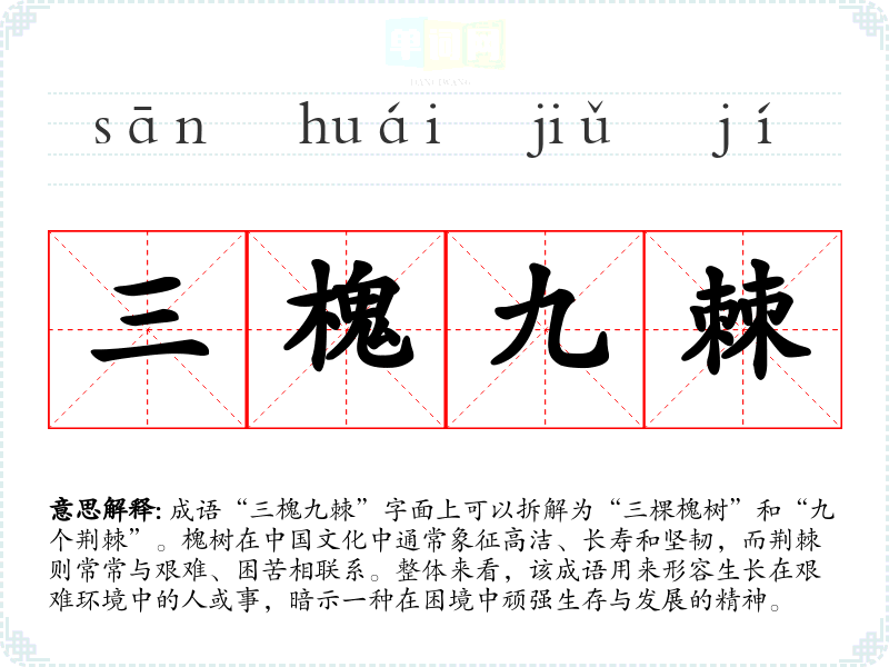 成语“三槐九棘”字面上可以拆解为“三棵槐树”和“九个荆棘”。槐树在**文化中通常象征高洁、长寿和坚韧,而荆棘则常常与艰难、困苦相联系。整体来看,该成语用来形容生长在艰难环境中的人或事,暗示一种在困境中顽强生存与发展的精神。
