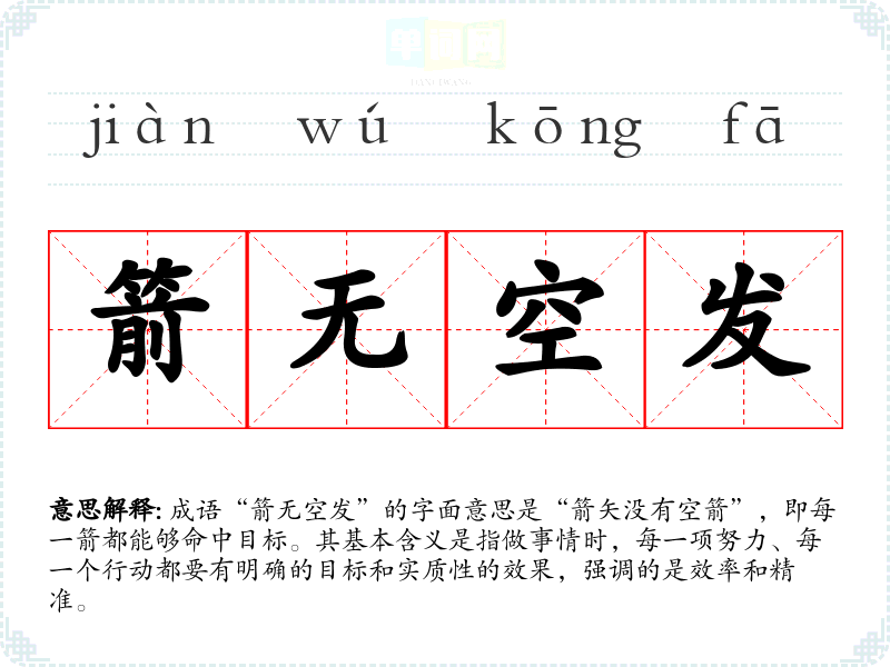 成语“箭无空发”的字面意思是“箭矢没有空箭”,即每一箭都能够命中目标。其基本含义是指做事情时,每一项努力、每一个行动都要有明确的目标和实质性的效果,强调的是效率和精准。