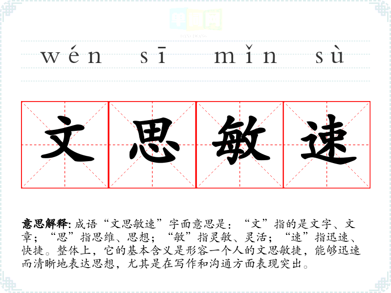 成语“文思敏速”字面意思是:“文”指的是文字、文章;“思”指思维、思想;“敏”指灵敏、灵活;“速”指迅速、快捷。整体上,它的基本含义是形容一个人的文思敏捷,能够迅速而清晰地表达思想,尤其是在写作和沟通方面表现突出。