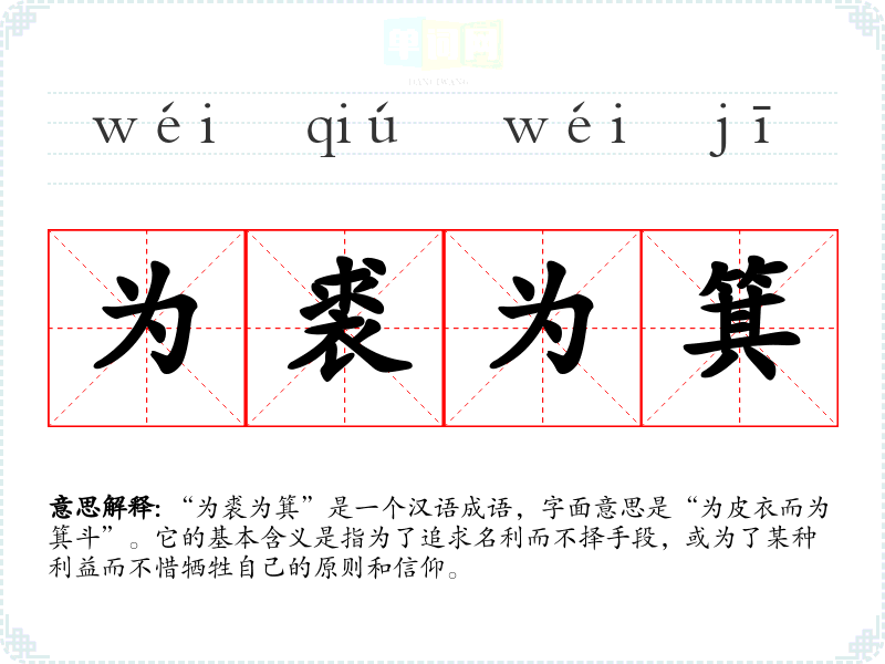 - 在职场中:“他为了升职加薪,真是‘为裘为箕’,一点原则都不顾。”