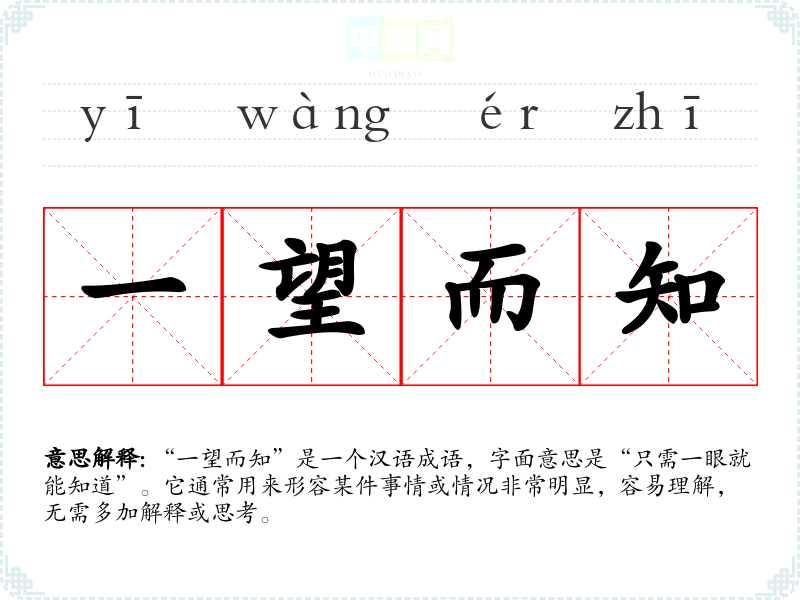“一望而知”是一个汉语成语,字面意思是“只需一眼就能知道”。它通常用来形容某件事情或情况非常明显,容易理解,无需多加解释或思考。
