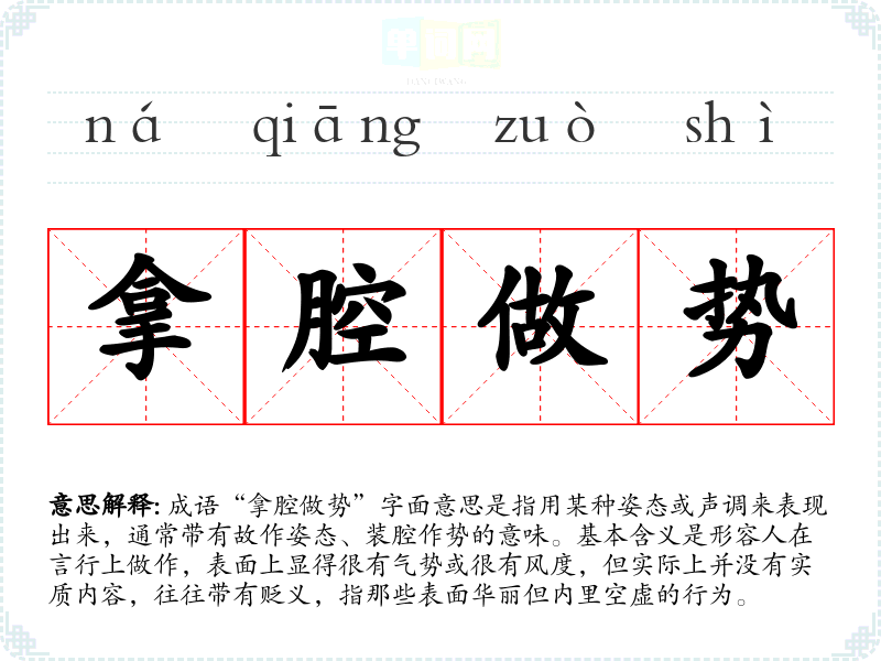 成语“拿腔做势”字面意思是指用某种姿态或声调来表现出来,通常带有故作姿态、装腔作势的意味。基本含义是形容人在言行上做作,表面上显得很有气势或很有风度,但实际上并没有实质内容,往往带有贬义,指那些表面华丽但内里空虚的行为。