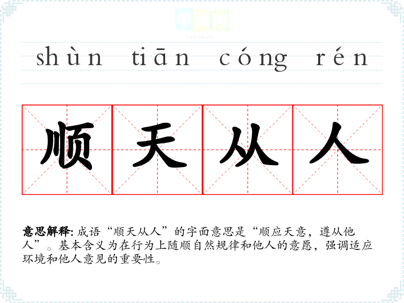 成语“顺天从人”的字面意思是“顺应天意,遵从他人”。基本含义为在行为上随顺自然规律和他人的意愿,强调适应环境和他人意见的重要性。