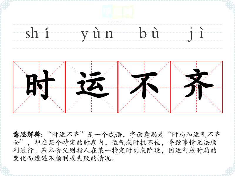 “时运不齐”是一个成语,字面意思是“时局和运气不齐全”,即在某个特定的时期内,运气或时机不佳,导致事情无法顺利进行。基本含义则指人在某一特定时刻或阶段,因运气或时局的变化而遭遇不顺利或失败的情况。