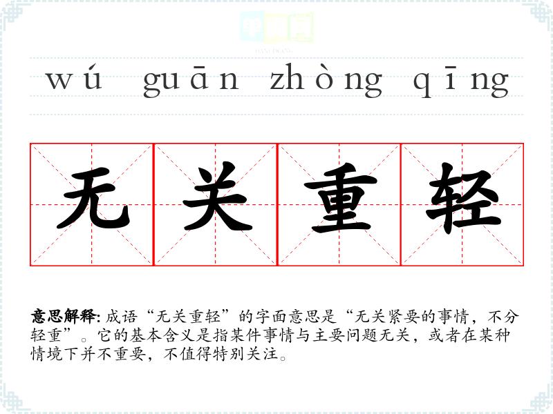 成语“无关重轻”的字面意思是“无关紧要的事情,不分轻重”。它的基本含义是指某件事情与主要问题无关,或者在某种情境下并不重要,不值得特别关注。