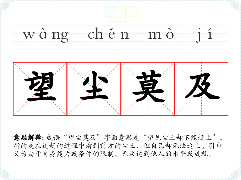 成语“望尘莫及”字面意思是“望见尘土却不能赶上”,指的是在追赶的过程中看到前方的尘土,但自己却无法追上。引申义为由于自身能力或条件的限制,无法达到他人的水平或成就。