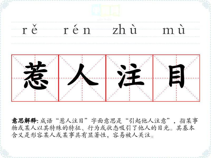 成语“惹人注目”字面意思是“引起他人注意”,指某事物或某人以其特殊的特征、行为或状态吸引了他人的目光。其基本含义是形容某人或某事具有显著性,容易被人关注。