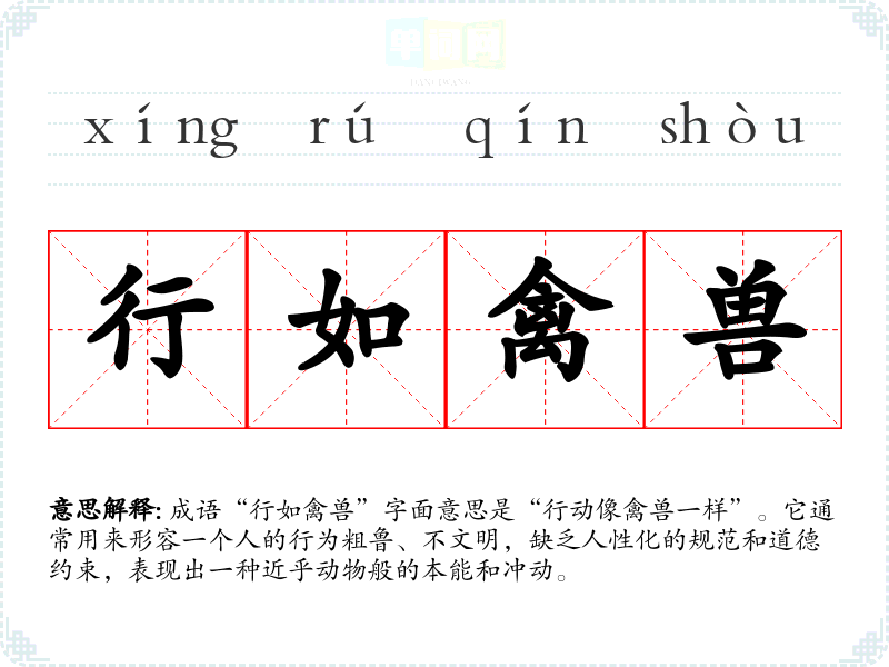 成语“行如禽兽”字面意思是“行动像禽兽一样”。它通常用来形容一个人的行为粗鲁、不文明,缺乏人性化的规范和道德约束,表现出一种近乎动物般的本能和冲动。