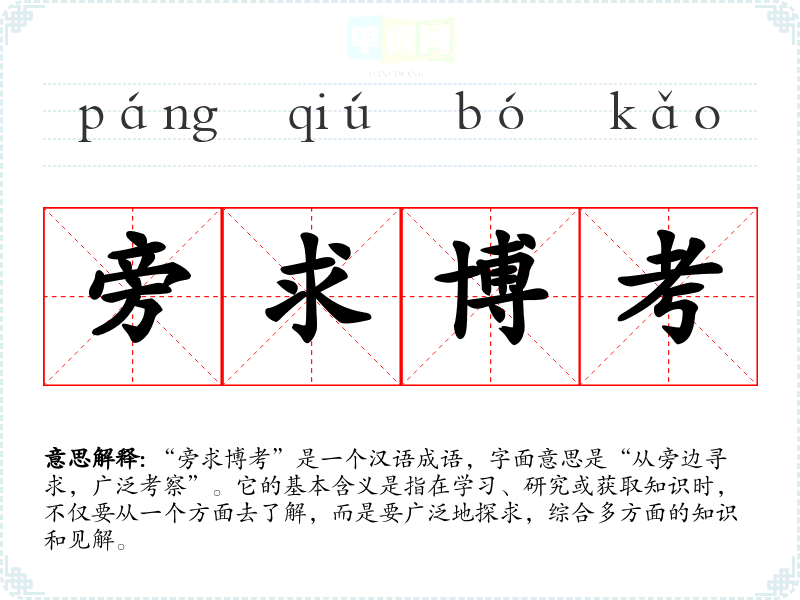 - 日常对话:朋友之间讨论学*方法时,可以提到“旁求博考”来鼓励对方多方位获取信息。