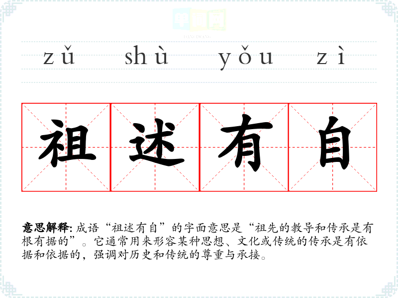 | 祖述有自 | 祖述:效法或遵循前人的行为和学说。指效法前人,又有自己的创新 |