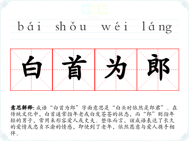 成语“白首为郎”字面意思是“白头时依然是郎君”。在传统文化中,白首通常指年老或白发苍苍的状态,而“郎”则指年轻的男子,常用来形容爱人或丈夫。整体而言,该成语表达了长久的爱情或忠贞不渝的情感,即使到了老年,依然愿意与爱人携手相伴。