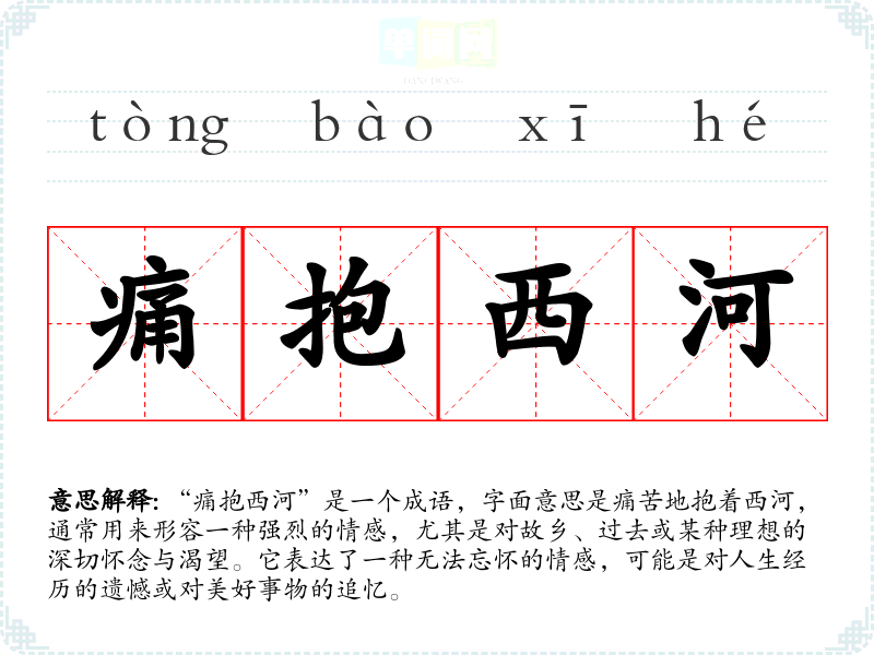 “痛抱西河”出自唐代诗人王维的诗作《送别》。在诗中,西河象征着故乡或过去的美好时光,表达了对离别和失去的痛苦与怀念。这个成语的使用背景反映了古人对故乡、亲人和美好时光的深切眷恋。