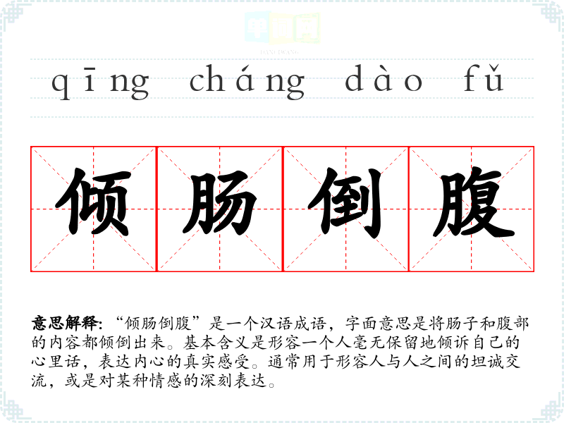 “倾肠倒腹”是一个汉语成语,字面意思是将肠子和腹部的内容都倾倒出来。基本含义是形容一个人毫无保留地倾诉自己的心里话,表达内心的真实感受。通常用于形容人与人之间的坦诚交流,或是对某种情感的深刻表达。