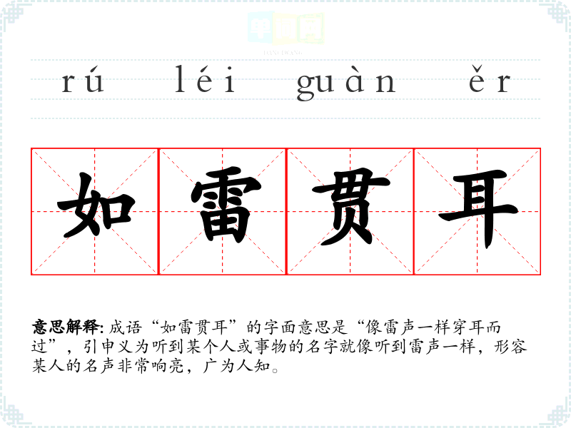 成语“如雷贯耳”的字面意思是“像雷声一样穿耳而过”,引申义为听到某个人或事物的名字就像听到雷声一样,形容某人的名声非常响亮,广为人知。