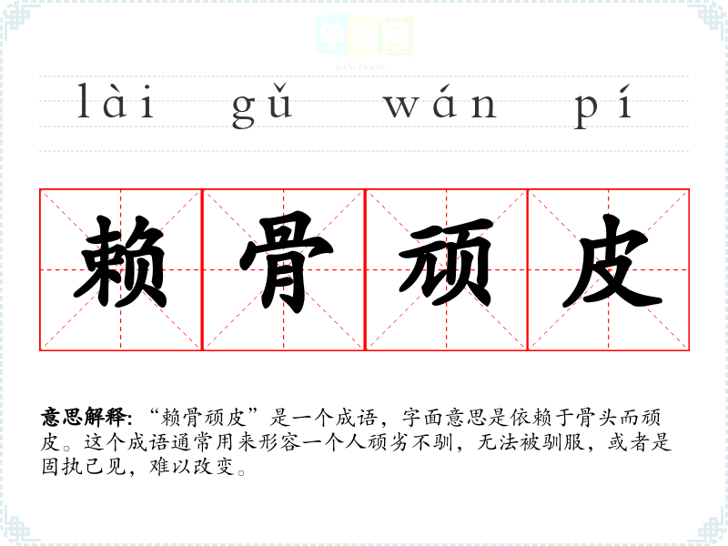 “赖骨顽皮”是一个成语,字面意思是依赖于骨头而顽皮。这个成语通常用来形容一个人顽劣不驯,无法被驯服,或者是固执己见,难以改变。