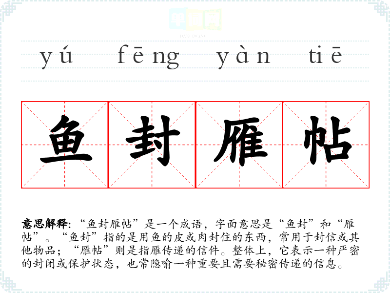 “鱼封雁帖”是一个成语,字面意思是“鱼封”和“雁帖”。“鱼封”指的是用鱼的皮或肉封住的东西,常用于封信或其他物品;“雁帖”则是指雁传递的信件。整体上,它表示一种严密的封闭或保护状态,也常隐喻一种重要且需要秘密传递的信息。
