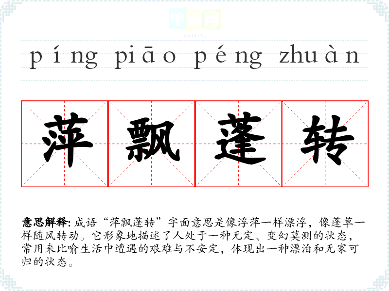 成语“萍飘蓬转”字面意思是像浮萍一样漂浮,像蓬草一样随风转动。它形象地描述了人处于一种无定、变幻莫测的状态,常用来比喻生活中遭遇的艰难与不安定,体现出一种漂泊和无家可归的状态。