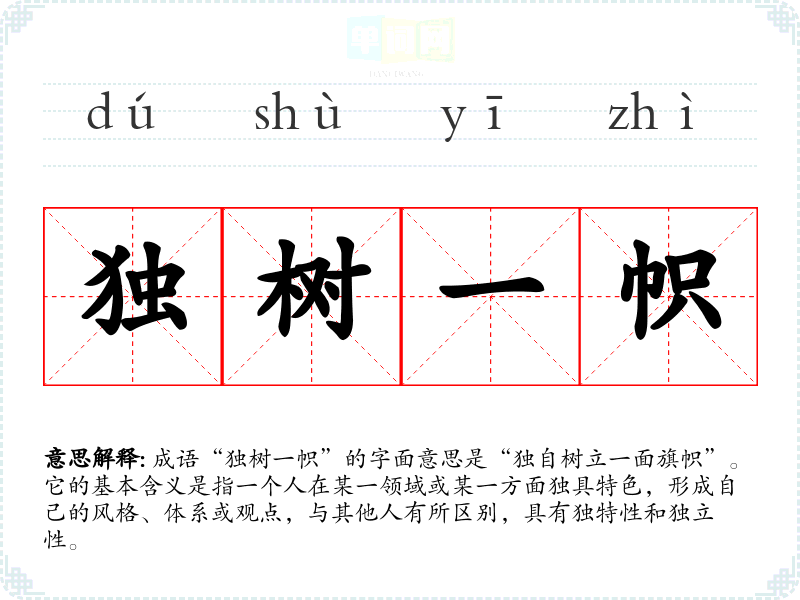 成语“独树一帜”的字面意思是“独自树立一面旗帜”。它的基本含义是指一个人在某一领域或某一方面独具特色,形成自己的风格、体系或观点,与其他人有所区别,具有独特性和独立性。