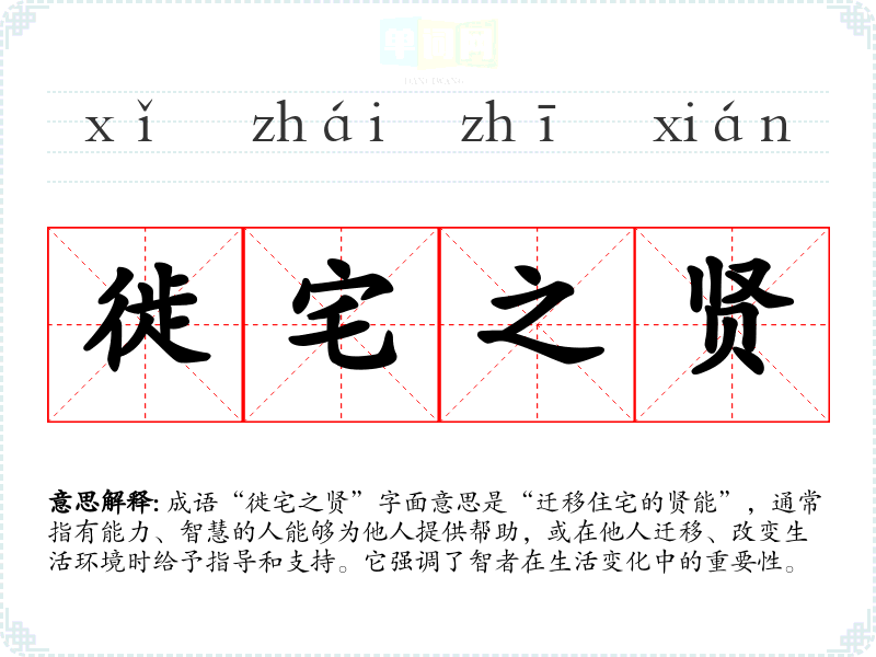 成语“徙宅之贤”字面意思是“迁移住宅的贤能”,通常指有能力、智慧的人能够为他人提供帮助,或在他人迁移、改变生活环境时给予指导和支持。它强调了智者在生活变化中的重要性。