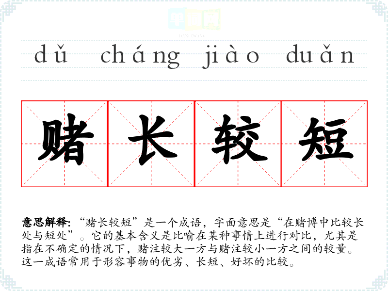 “赌长较短”并没有明确的历史典故或文学出处,但其构成的词汇“赌”、“长”、“短”在汉语中是常见的表述,表达了比较和对照的含义。成语的产生与古代赌博文化、比拼精神密切相关,赌博本身就是一种风险与收益的较量,而“长”与“短”的对比则是人们在生活中常常进行的评估。