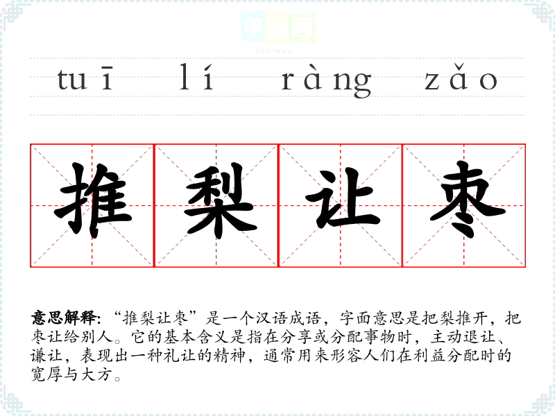 “推梨让枣”是一个汉语成语,字面意思是把梨推开,把枣让给别人。它的基本含义是指在分享或分配事物时,主动退让、谦让,表现出一种礼让的精神,通常用来形容人们在利益分配时的宽厚与大方。