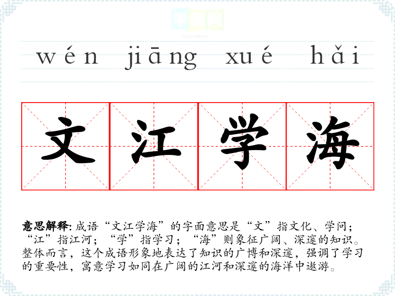 成语“文江学海”的字面意思是“文”指文化、学问;“江”指江河;“学”指学;“海”则象征广阔、深邃的知识。整体而言,这个成语形象地表达了知识的广博和深邃,强调了学的重要性,寓意学*如同在广阔的江河和深邃的海洋中遨游。