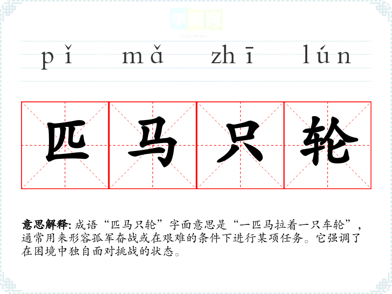 成语“匹马只轮”字面意思是“一匹马拉着一只车轮”,通常用来形容孤军奋战或在艰难的条件下进行某项任务。它强调了在困境中独自面对挑战的状态。