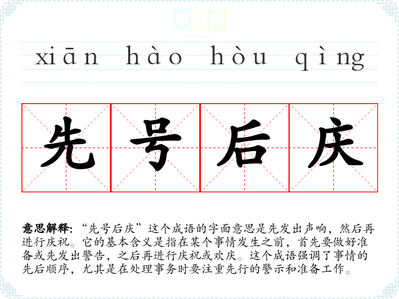 “先号后庆”这个成语的字面意思是先发出声响,然后再进行庆祝。它的基本含义是指在某个事情发生之前,首先要做好准备或先发出警告,之后再进行庆祝或欢庆。这个成语强调了事情的先后顺序,尤其是在处理事务时要注重先行的警示和准备工作。