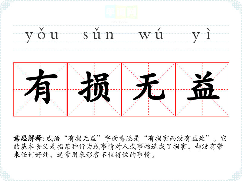 成语“有损无益”字面意思是“有损害而没有益处”。它的基本含义是指某种行为或事情对人或事物造成了损害,却没有带来任何好处,通常用来形容不值得做的事情。