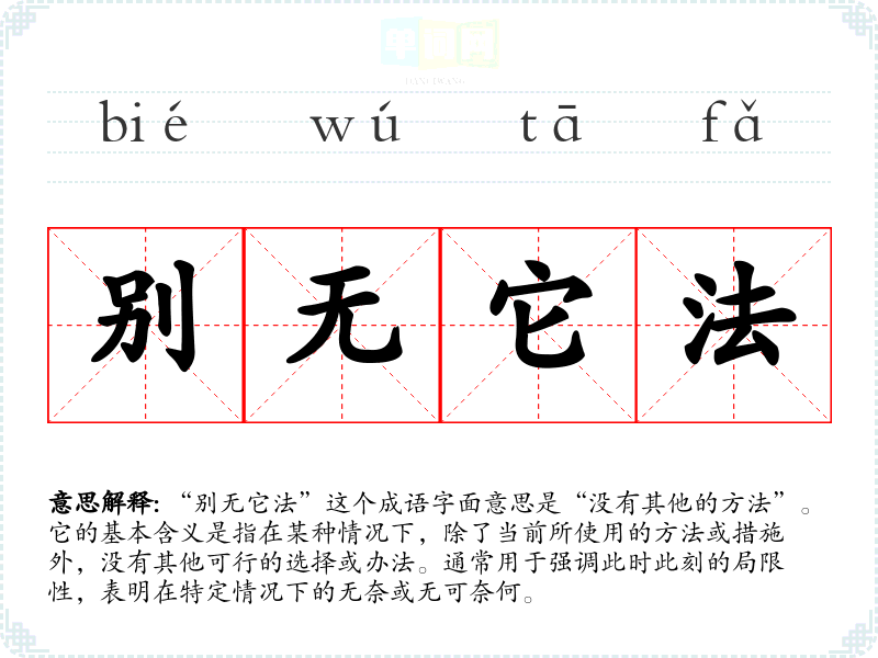 “别无它法”这个成语字面意思是“没有其他的方法”。它的基本含义是指在某种情况下,除了当前所使用的方法或措施外,没有其他可行的选择或办法。通常用于强调此时此刻的局限性,表明在特定情况下的无奈或无可奈何。