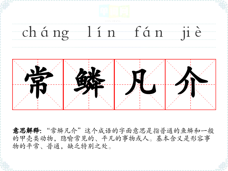 “常鳞凡介”这个成语的字面意思是指普通的鱼鳞和一般的甲壳类动物,隐喻常见的、平凡的事物或人。基本含义是形容事物的平常、普通,缺乏特别之处。