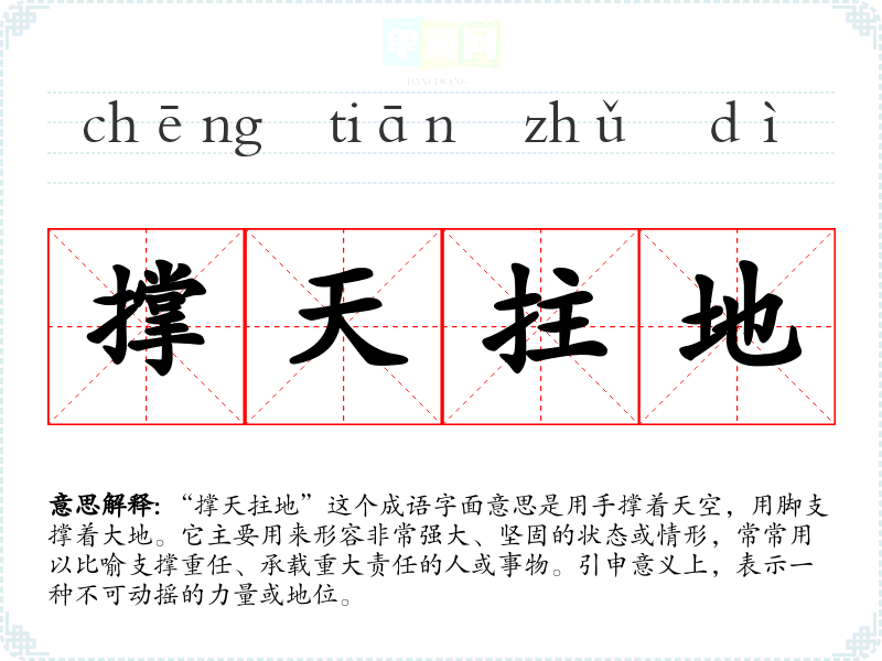 “撑天拄地”这个成语字面意思是用手撑着天空,用脚支撑着大地。它主要用来形容非常强大、坚固的状态或情形,常常用以比喻支撑重任、承载重大责任的人或事物。引申意义上,表示一种不可动摇的力量或地位。