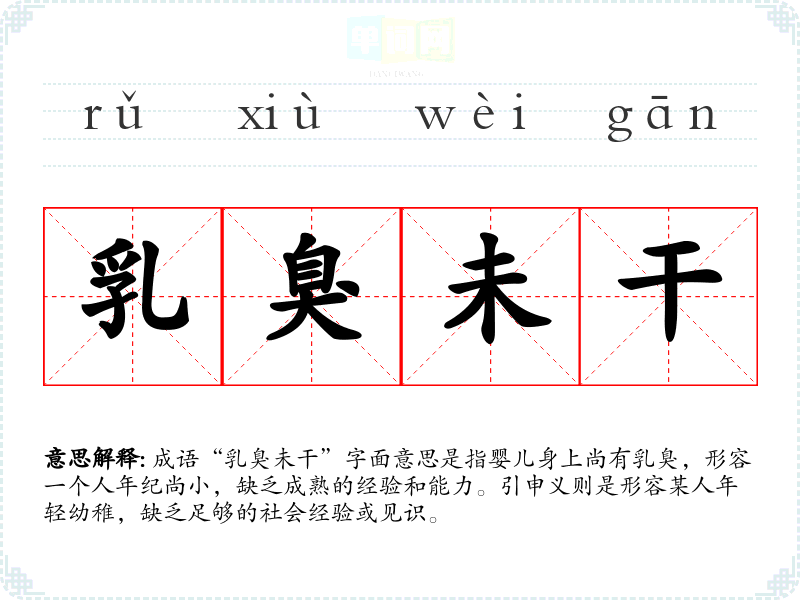成语“乳臭未干”字面意思是指婴儿身上尚有乳臭,形容一个人年纪尚小,缺乏成熟的经验和能力。引申义则是形容某人年轻幼稚,缺乏足够的社会经验或见识。
