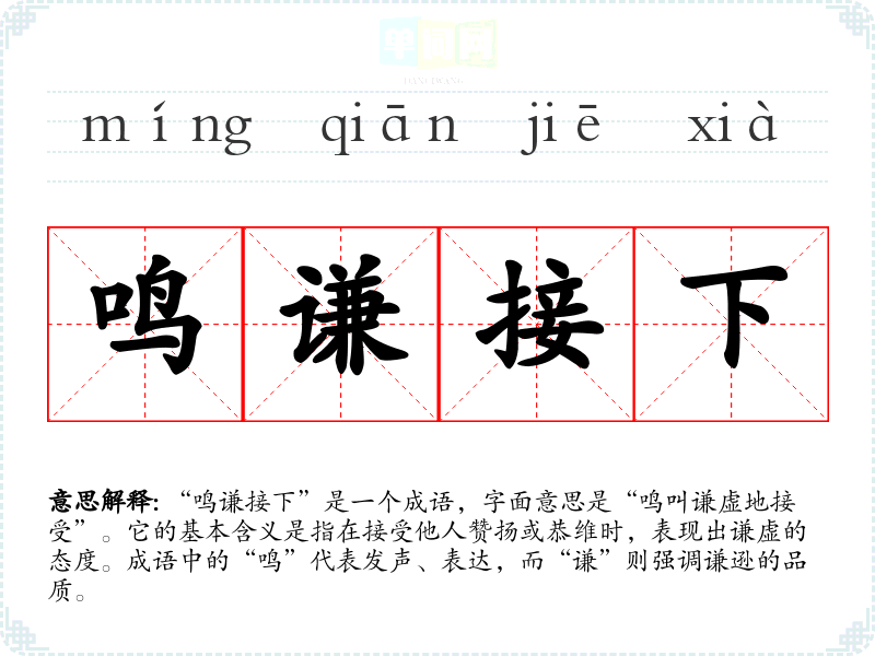 “鸣谦接下”源于古代的文人雅士交流中,常常在面对他人的赞美时,表现出谦逊的态度,以示对他人和社会的尊重。具体的成语出处不易考证,但可以联系到中国古代文人对谦虚品质的重视,以及“谦谦君子”的道德标准。