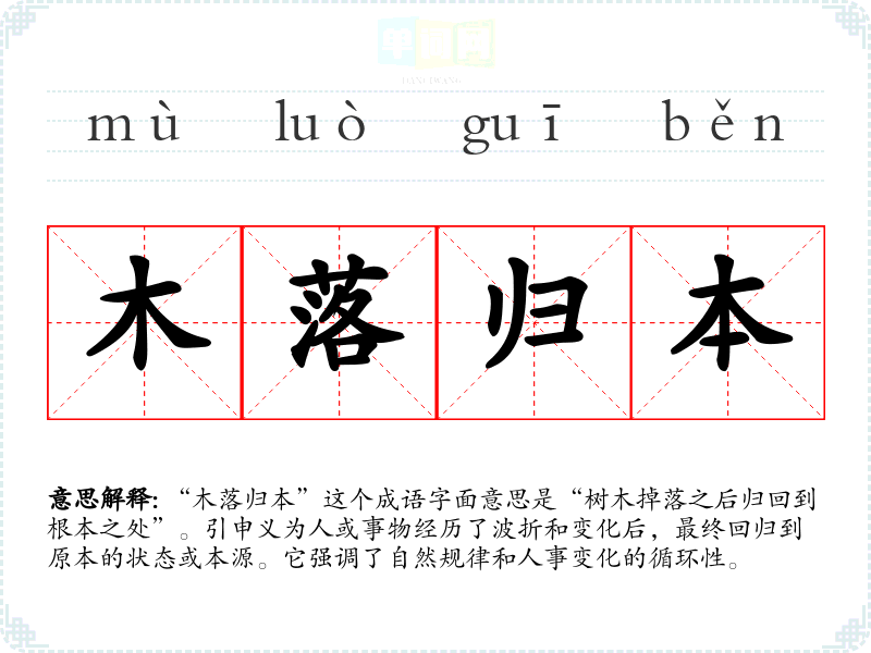“木落归本”这个成语字面意思是“树木掉落之后归回到根本之处”。引申义为人或事物经历了波折和变化后,最终回归到原本的状态或本源。它强调了自然规律和人事变化的循环性。