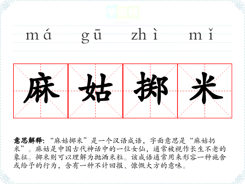 “麻姑掷米”出自《太原志》。在古代文献中,麻姑被描绘为一个施舍米粒的仙女,象征着对人间的恩惠与救助。这个成语的形成与古代道教文化、仙人崇拜有关,麻姑的形象在民间传说中颇具影响力。