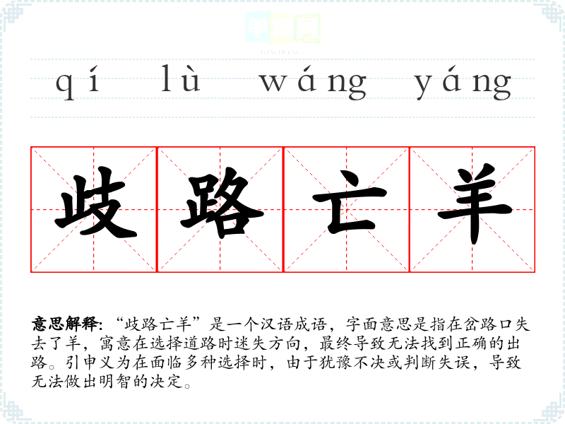 “歧路亡羊”是一个汉语成语,字面意思是指在岔路口失去了羊,寓意在选择道路时迷失方向,最终导致无法找到正确的出路。引申义为在面临多种选择时,由于犹豫不决或判断失误,导致无法做出明智的决定。