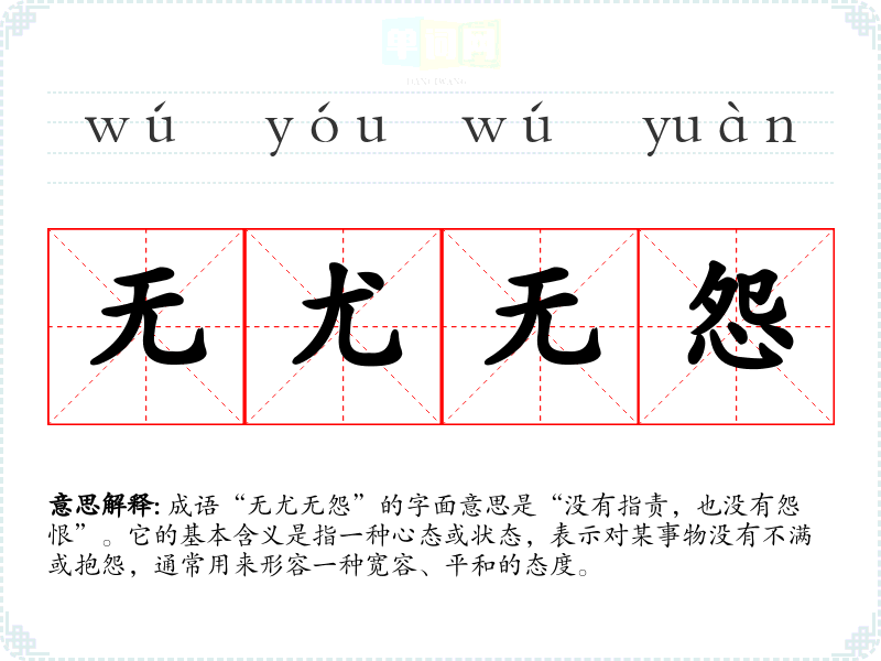 成语“无尤无怨”的字面意思是“没有指责,也没有怨恨”。它的基本含义是指一种心态或状态,表示对某事物没有不满或抱怨,通常用来形容一种宽容、平和的态度。