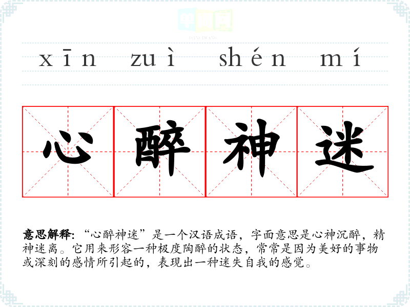 “心醉神迷”是一个汉语成语,字面意思是心神沉醉,精神迷离。它用来形容一种极度陶醉的状态,常常是因为美好的事物或深刻的感情所引起的,表现出一种迷失自我的感觉。