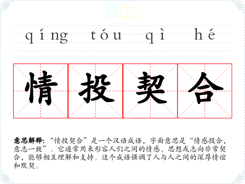 “情投契合”是一个汉语成语,字面意思是“情感投合,意志一致”。它通常用来形容人们之间的情感、思想或志向非常契合,能够相互理解和支持。这个成语强调了人与人之间的深厚情谊和默契。