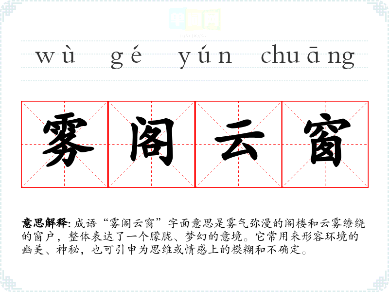 成语“雾阁云窗”字面意思是雾气弥漫的阁楼和云雾缭绕的窗户,整体表达了一个朦胧、梦幻的意境。它常用来形容环境的幽美、神秘,也可引申为思维或情感上的模糊和不确定。