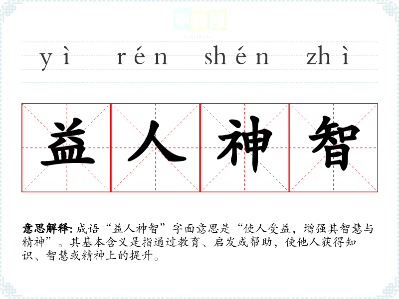 成语“益人神智”字面意思是“使人受益,增强其智慧与精神”。其基本含义是指通过教育、启发或帮助,使他人获得知识、智慧或精神上的提升。