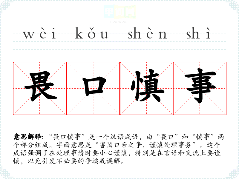 - 演讲:在演讲或公共发言中,发言者可能会提到“畏口慎事”,以强调言辞的谨慎和分寸。