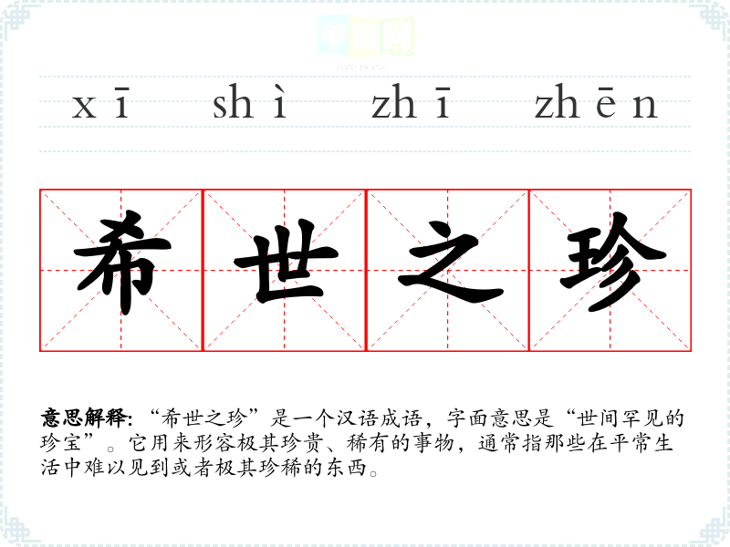 “希世之珍”是一个汉语成语,字面意思是“世间罕见的珍宝”。它用来形容极其珍贵、稀有的事物,通常指那些在平常生活中难以见到或者极其珍稀的东西。