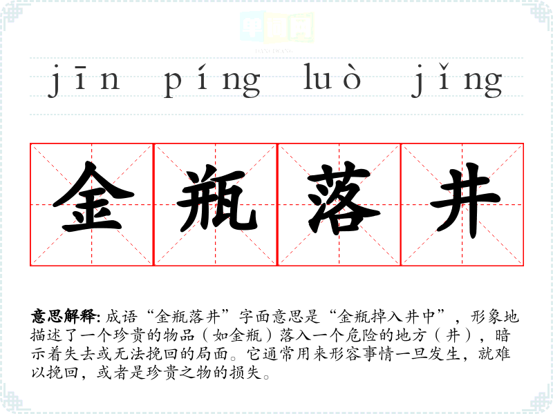成语“金瓶落井”字面意思是“金瓶掉入井中”,形象地描述了一个珍贵的物品(如金瓶)落入一个危险的地方(井),暗示着失去或无法挽回的局面。它通常用来形容事情一旦发生,就难以挽回,或者是珍贵之物的损失。