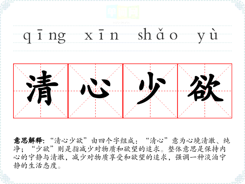 “清心少欲”由四个字组成:“清心”意为心境清澈、纯净;“少欲”则是指减少对物质和欲望的追求。整体意思是保持内心的宁静与清澈,减少对物质享受和欲望的追求,强调一种淡泊宁静的生活态度。
