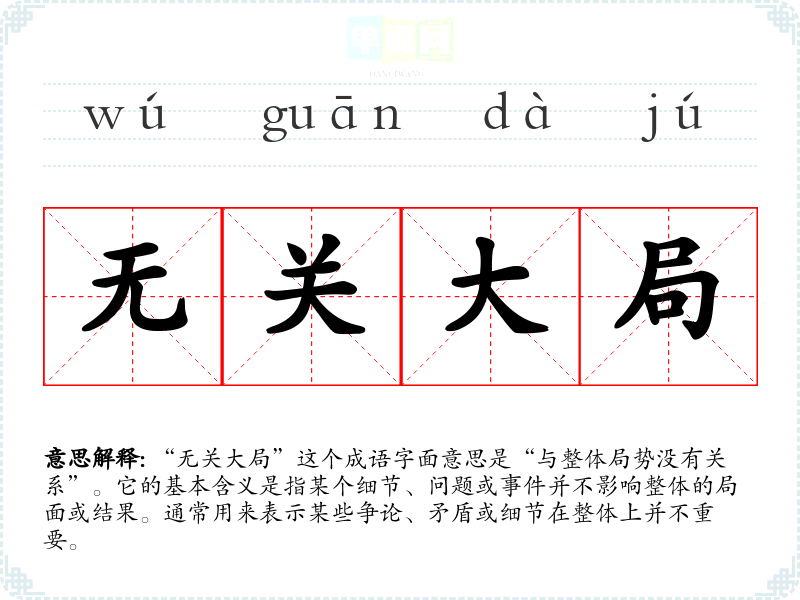 “无关大局”这个成语字面意思是“与整体局势没有关系”。它的基本含义是指某个细节、问题或**并不影响整体的局面或结果。通常用来表示某些争论、矛盾或细节在整体上并不重要。