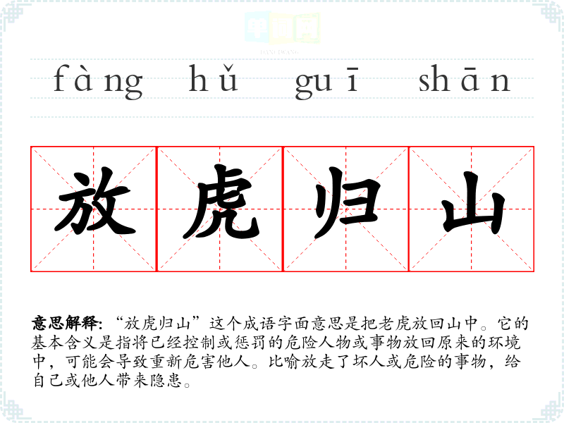 “放虎归山”这个成语字面意思是把**放回山中。它的基本含义是指将已经控制或惩罚的危险人物或事物放回原来的环境中,可能会导致重新危害他人。比喻放走了坏人或危险的事物,给自己或他人带来隐患。